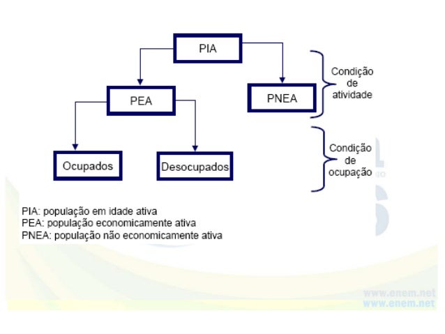 Nesse sentido, a PIA divide-se em dois grupos: A População Economicamente Ativa (PEA) e a População Não Economicamente Ativa (PNEA). A PEA engloba as pessoas maiores de 10 anos e que podem trabalhar, independentemente se estão ou não no momento. Ela subdivide-se em População Ocupada (PO) E População Desocupada (PD).
