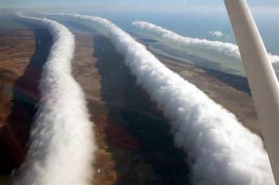Para encerrar a nossa lista, a gente não podia deixar de lado a nuvem Morning Glory: um verdadeiro espetáculo da natureza que encanta e intriga quem tem a sorte de presenciar. Esse fenômeno raro acontece na região de Burketown, na Austrália, geralmente entre setembro e novembro, e forma uma imensa nuvem tubular que pode se estender por até 1.000 quilômetros no céu.