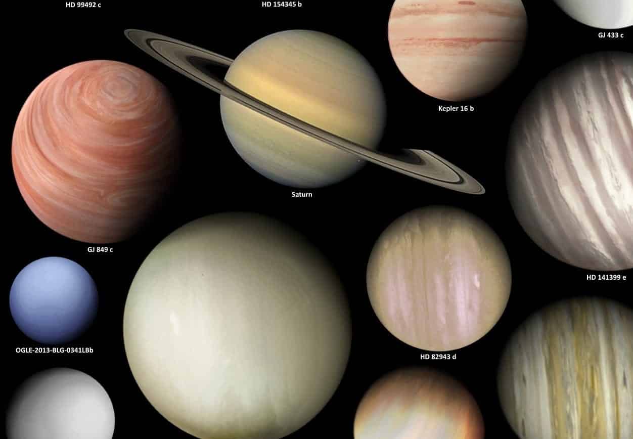 Foram considerados ainda pelo produtor a idade e a metalicidade das estrelas que abrigam esses exoplanetas ao montar o infográfico. São alguns exemplos dos exoplanetas identificados e retratados: super-Terras, Júpiteres Quentes, Netunos Gigantescos e Mini Netunos.
