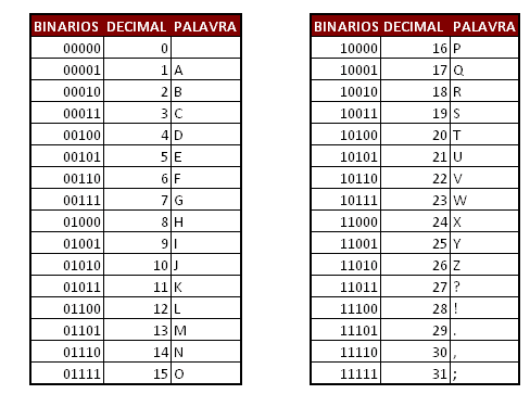 Enfim, essa tabela é apenas um exemplo, mas existem outras tabelas com base em qualquer sequência ou com outros caracteres, tais como letras minúsculas, letras acentuadas, símbolos etc.